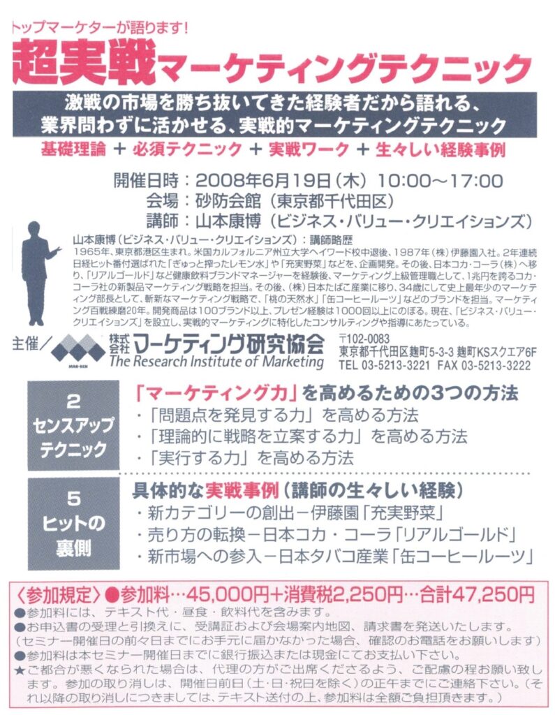 大手広告代理店、各分野メーカー様、宣伝会議マーケティング関連講座等にてナンバーワン顧客満足度獲得。 劇場型ハイスピード時間があっという間に過ぎると好評の”企画・プレゼン・ヒット極意”などセミナー、企業研修講師、全国のロータリークラブ、商工会議所、ライオンズクラブでのセミナーなどで活動。実務家。